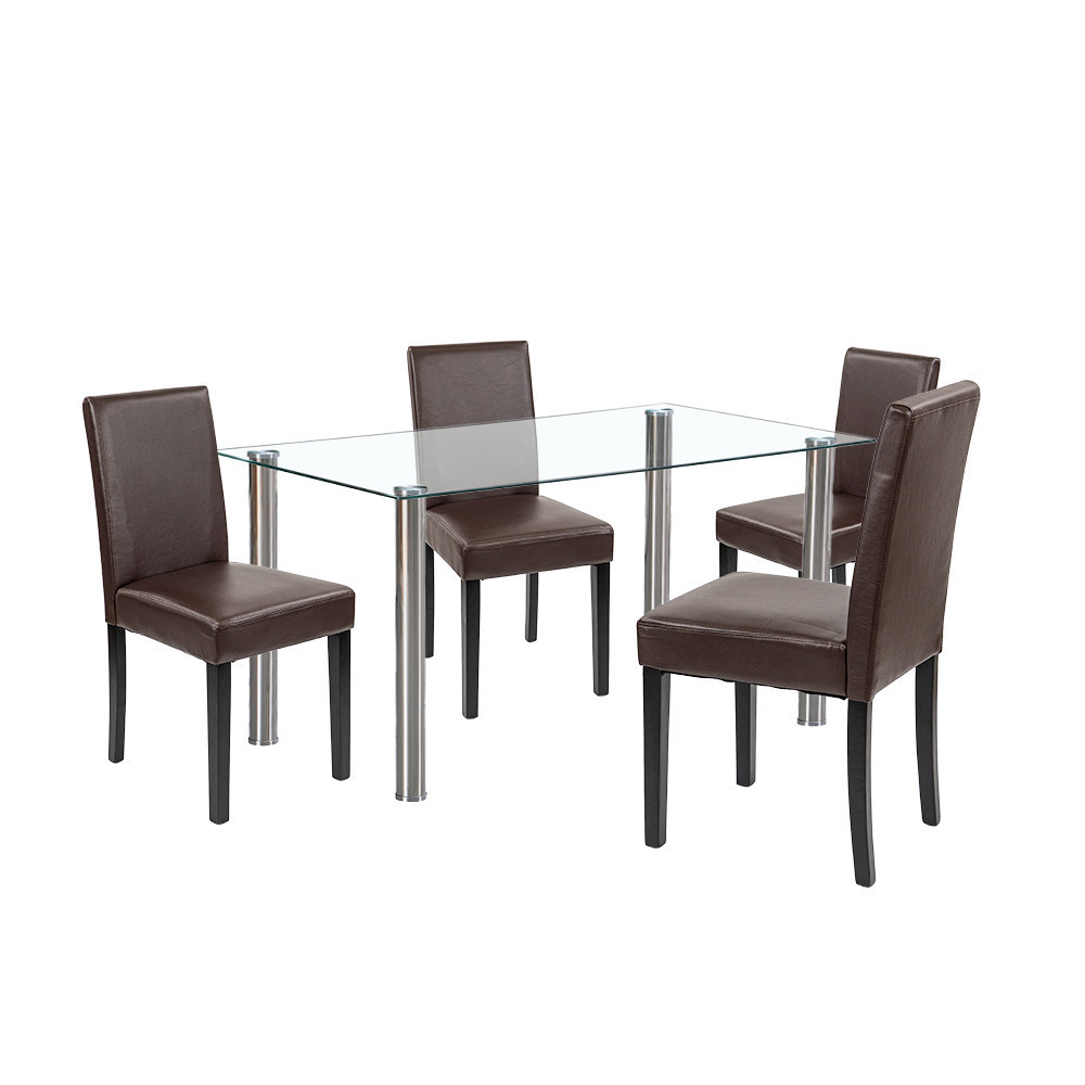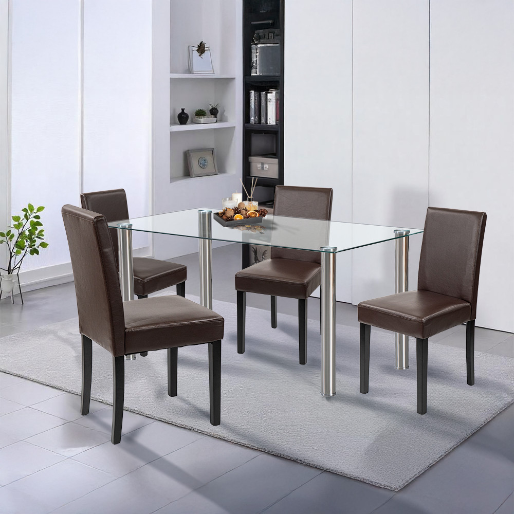 A szett négy darab Leziter Kelly széket is tartalmaz, amelyek barna ECO bőr kárpitozással készültek. Az elegáns megjelenés mellett ezek a székek rendkívül könnyen tisztíthatók. A 4 cm vastag habszivacs ülőfelület hosszabb étkezések során is komfortot nyújt, a stabil fenyőfa lábak pedig 120 kg teherbírással garantálják a hosszú távú megbízhatóságot.