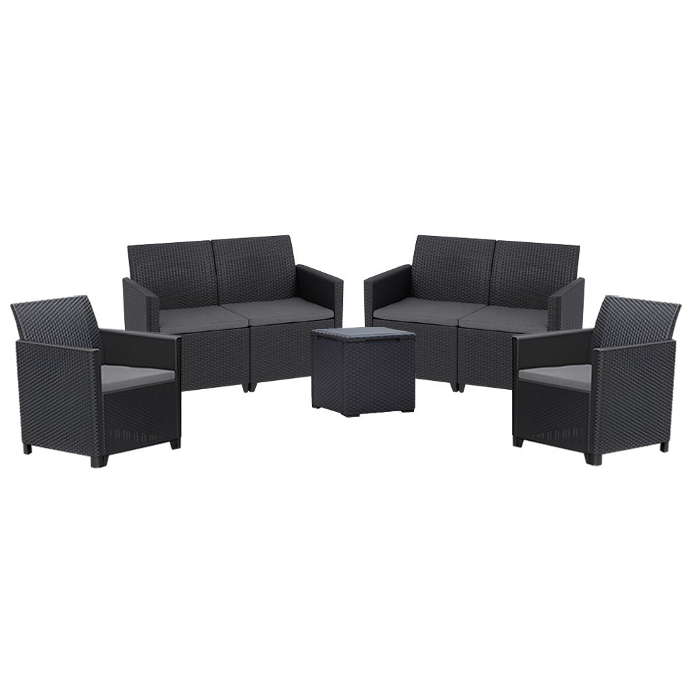 Ez a Grafit színű rattan hatású kerti bútor szett két fotellel, egy 6 személyes sarokkanapéval és egy tárolós asztallal rendelkezik, amelyeket időjárásálló műanyagból készítettek, így nem kell aggódnod a UV sugárzás hatásaitól sem. A fotel magassága: 74 cm, szélessége: 63 cm, hossza: 65 cm. A fotel és a kanapé párnával rendelkezik, mely kényelmessé teszi és színben passzol a bútorhoz. Az asztal magassága: 37 cm, szélessége: 37 cm, hossza: 37. Az asztal több funkciós, így a tároló részében elrejtheted a kerti eszközöket.