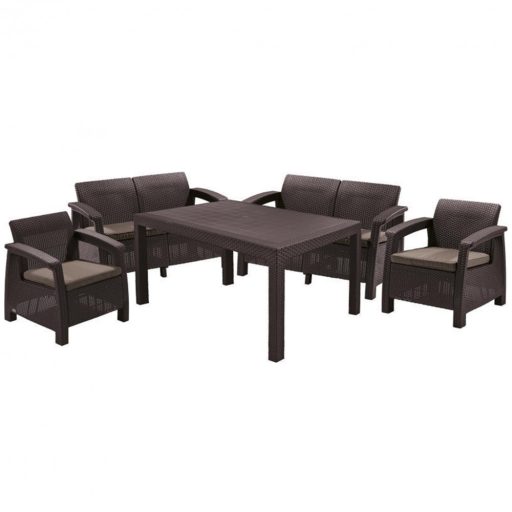 A Corfu Fiesta Set két darab fotelből, két darab kétszemélyes kanapéból és egy Melody asztalból áll. A bútorokat a