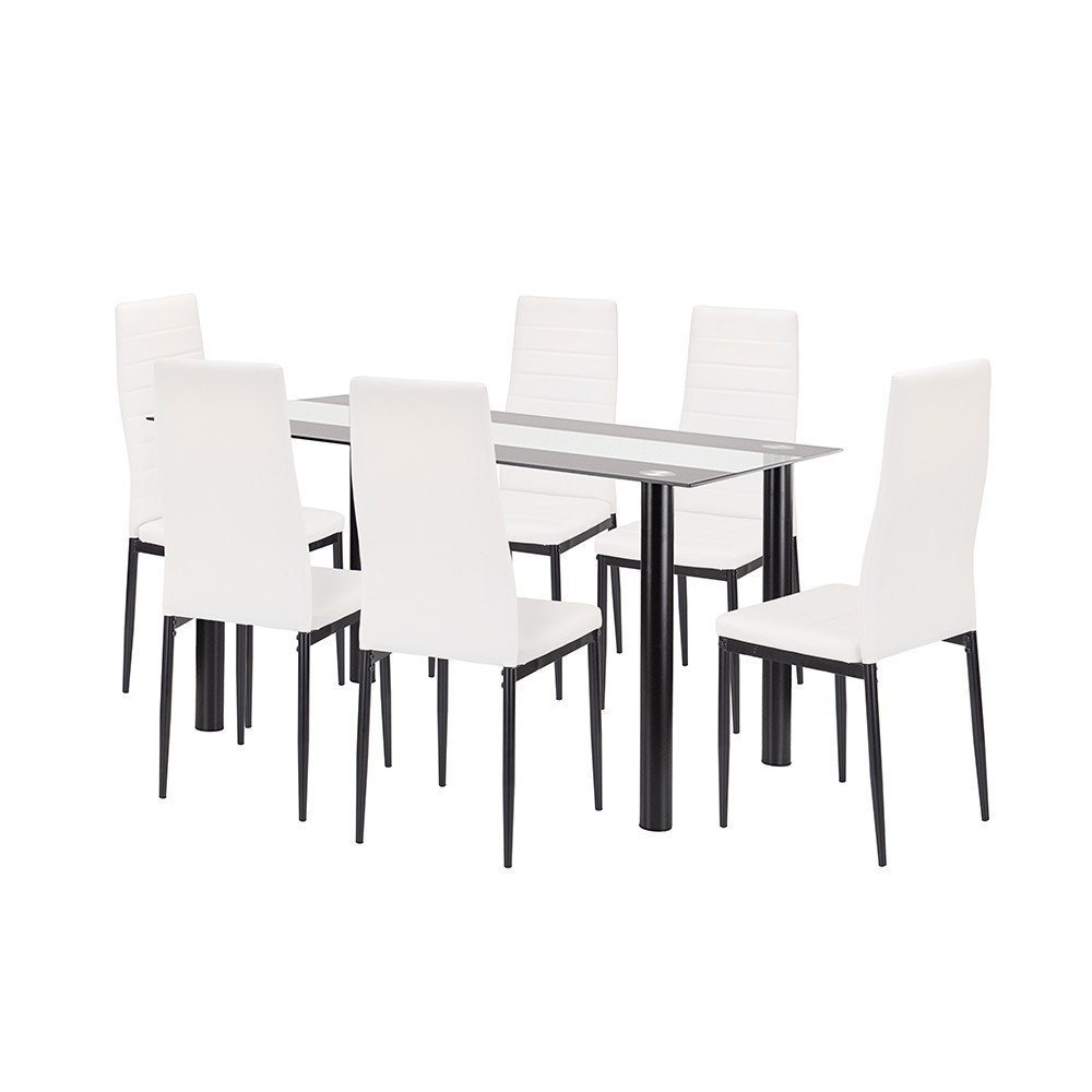 A fehér-fekete színkombináció remekül harmonizál a füstszürke üvegasztal színvilágával, így a teljes szett vizuálisan is egységes és kiegyensúlyozott.