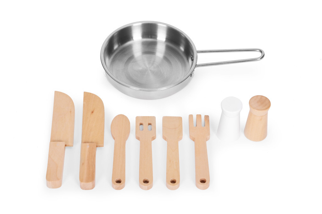 A játékkonyhát úgy tervezték, hogy mindennek meglegyen a helye. A kis szakács a fából készült, biztonságos késeit egy speciális állványba teszi közvetlenül a mosogató mellé, a többi konyhai kiegészítőt pedig akasztókra akasztja a tűzhelyek fölé. Ennek köszönhetően gyermeke megtanulja rendben tartani a konyhát.