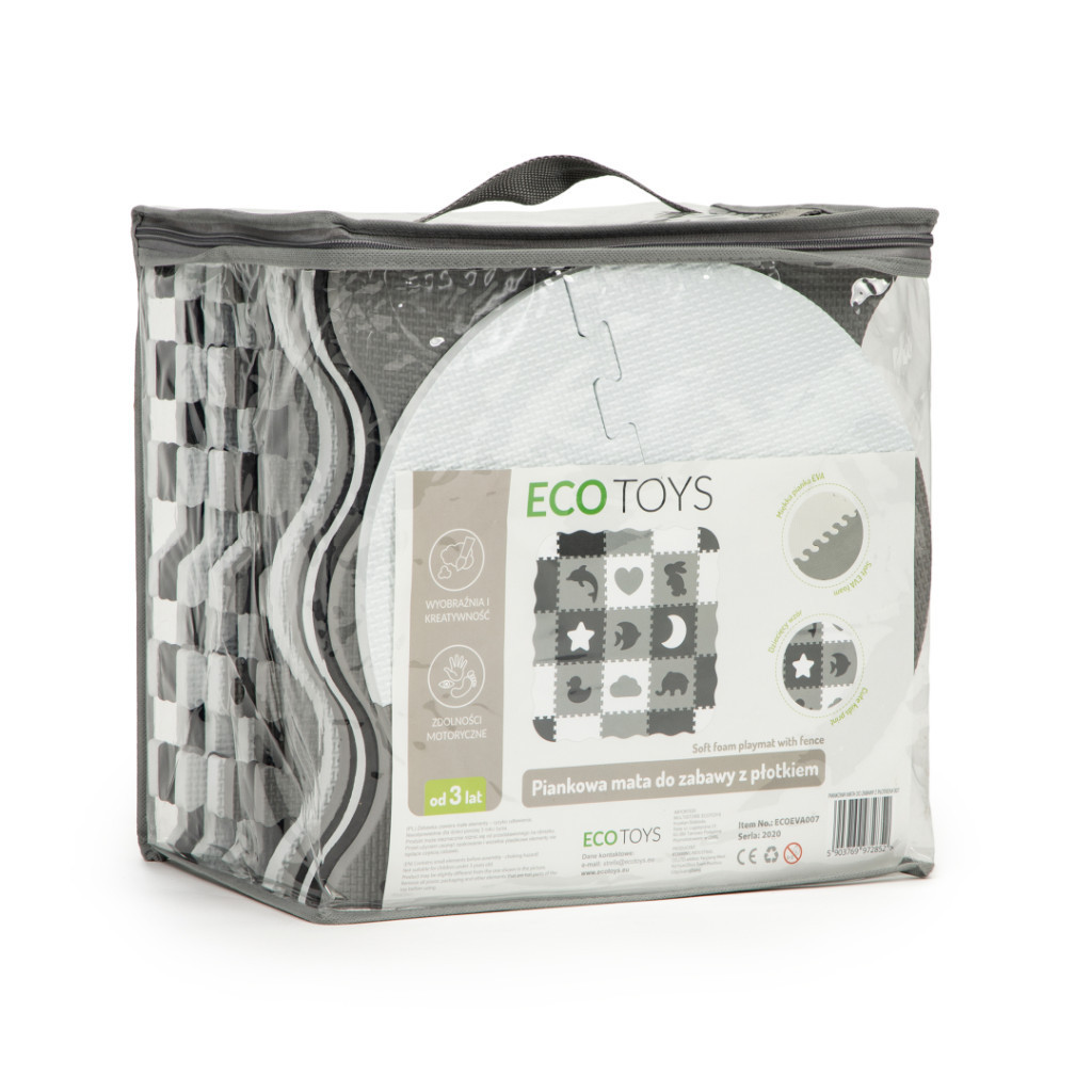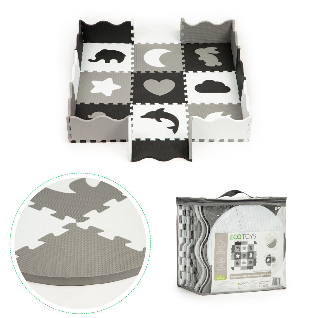 • A készlet **9 négyzetből és **16 további oldalsó elemből** áll. elemek. Az élek különleges „fogakkal” rendelkeznek, amelyeknek köszönhetően bármilyen módon kombinálhatók. A **szőnyeg** vastagsága (1,4 cm)** megfelelő védelmet nyújt esés esetén, és kellemesen puhává teszi.