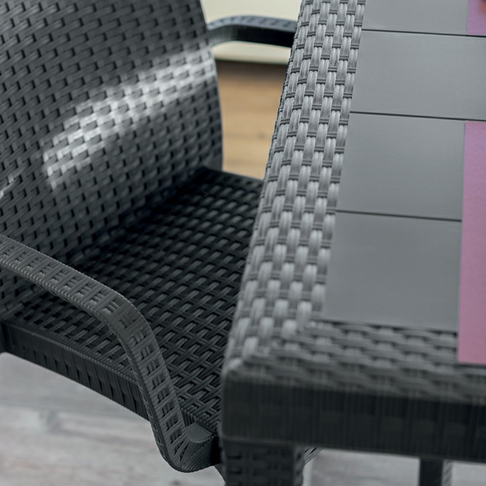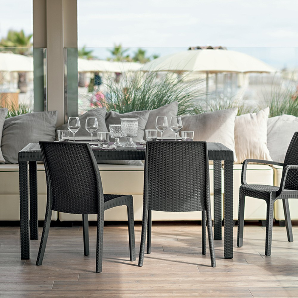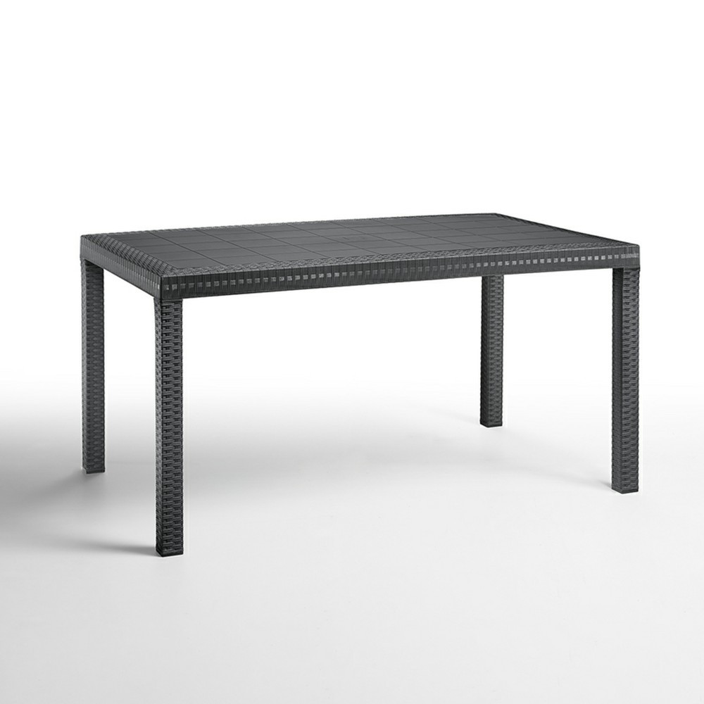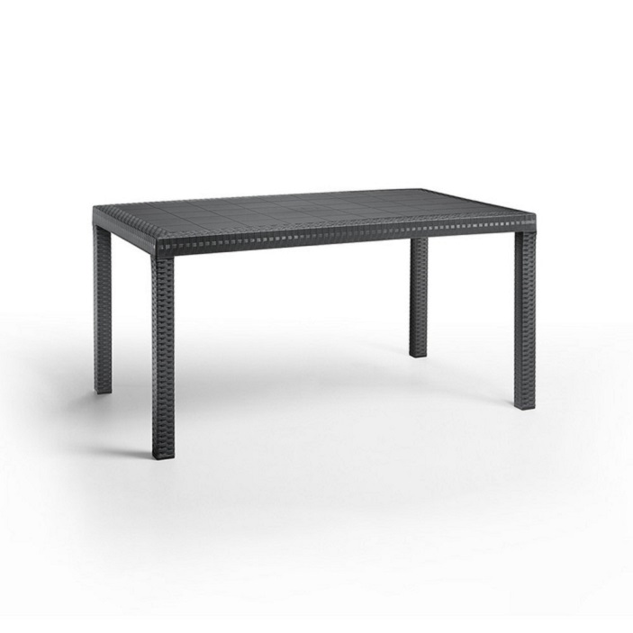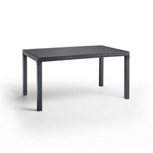 Olaszországban készült ez a grafit színű, kényelmes és elegáns, 150x 90x 74 cm-es négyszögletes magas rattan asztal. Időjárás álló műanyagból készült, medence mellé is tehető. Időtálló bútordarab, évek múlva is olyan lesz, mint ha még új lenne. Könnyen összeszerelhető, nincs szükség szakmai tudáshoz hozzá.