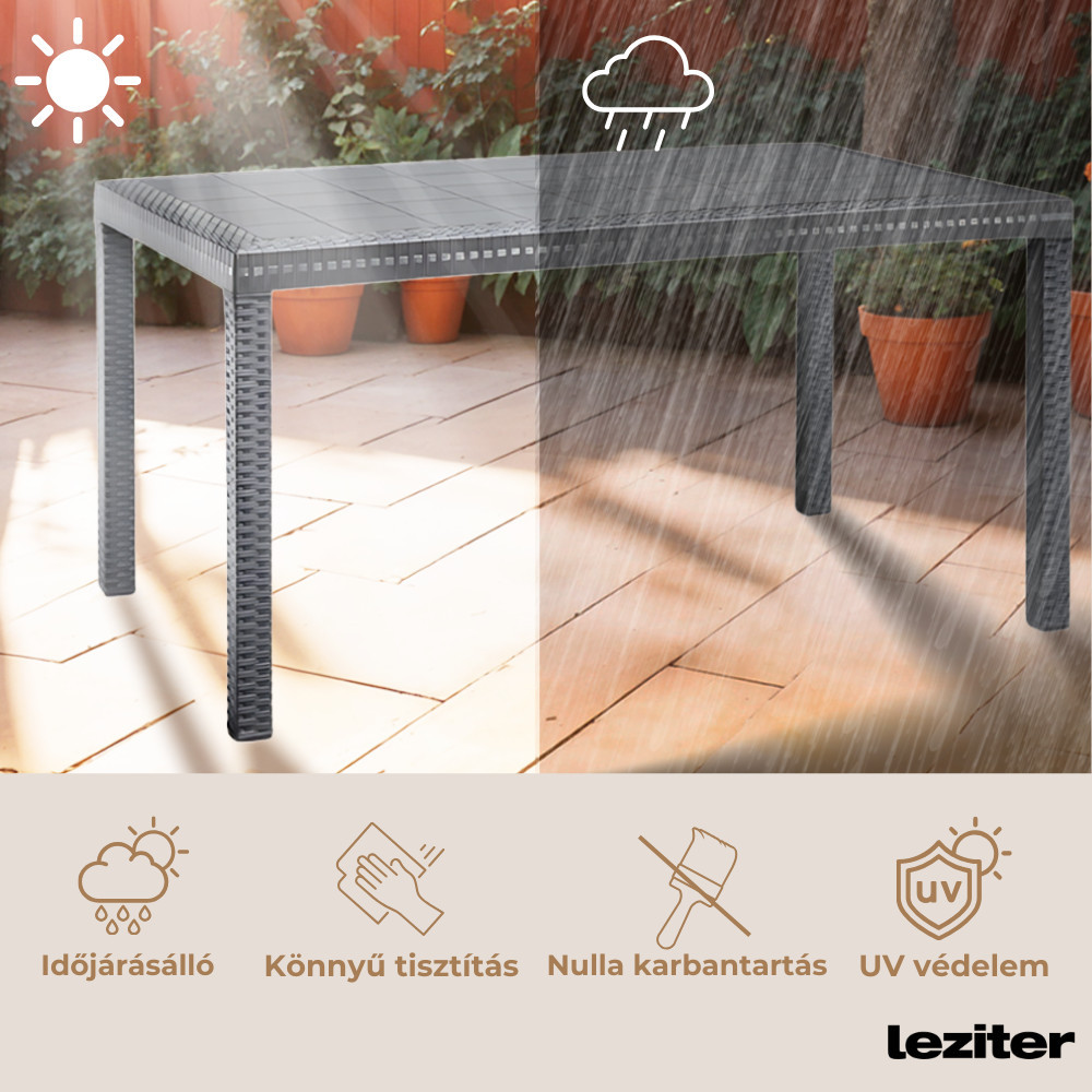Strapabíró anyaga: UV sugárzásnak és az időjárás viszontagságainak ellenálló műanyagból készült. Az asztal ideálisan beleillik minden ház körüli térbe, ahol ideális helyet teremt a szabad levegőn való pihenéshez. Modern stílus által inspirált felület a termék esztétikai előnyei közé sorolható.