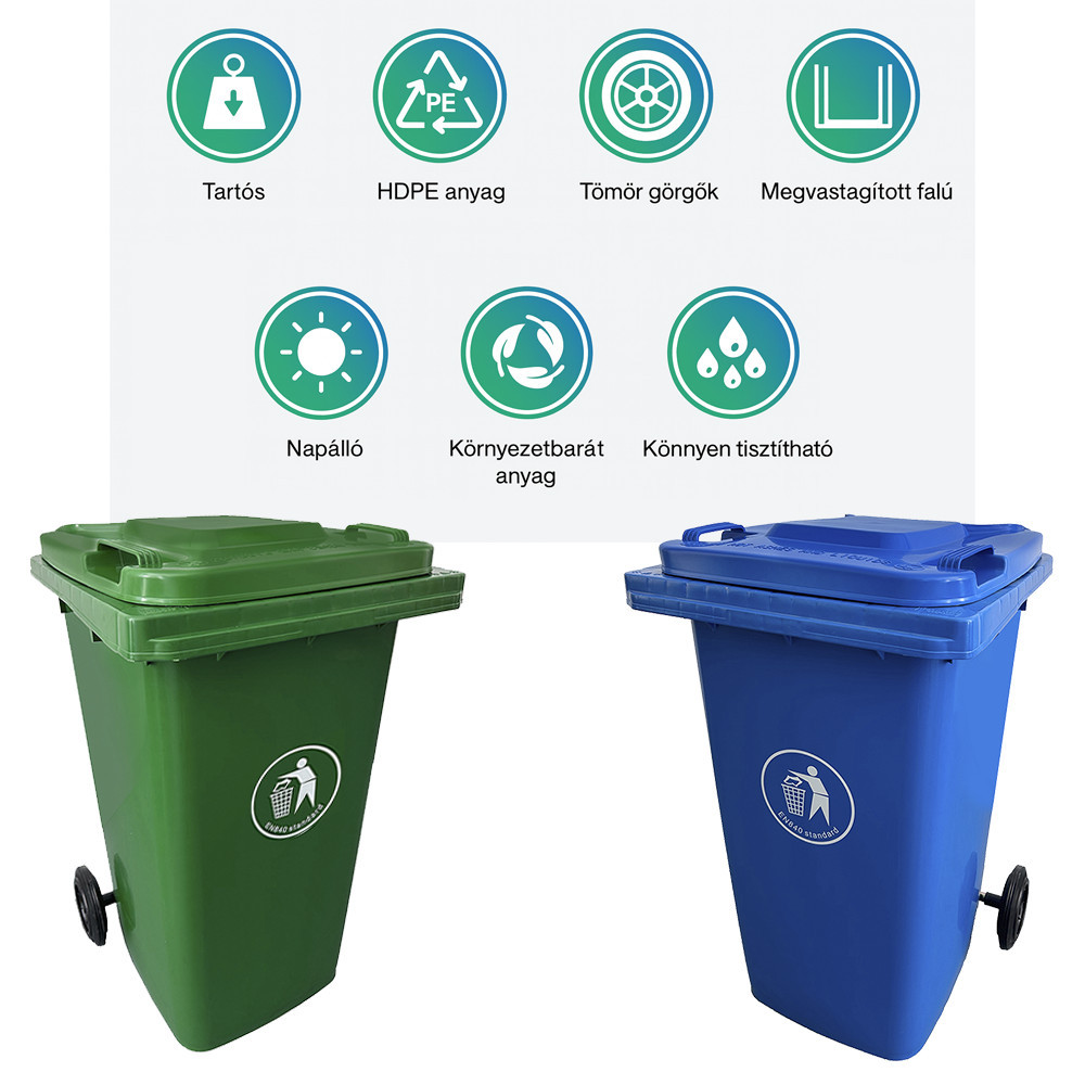 - Űrtartalom: 240 liter, ideális a napi hulladékgyűjtéshez.