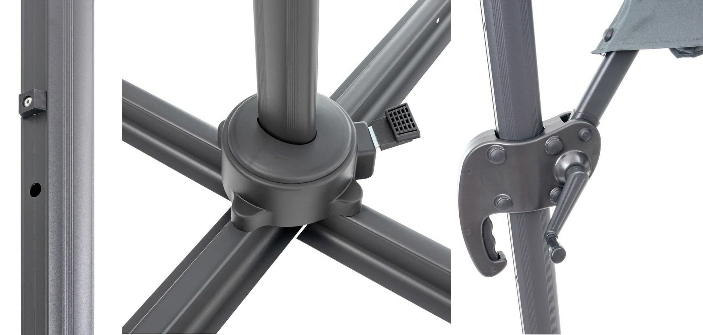 A kerti napernyő stabilitását jelentősen befolyásolja a kereszt talp. Az Ön kényelme érdekében egy rögzített fogantyú segítségével könnyen összecsukható. A napernyő előnye az alapban lévő forgó mechanizmus és a dőlésszög beállítás kombinációja. Ez lehetővé teszi az ernyő tetszőleges pozícionálását és az árnyékoló hely kiválasztását a napfény beesési szögének megfelelően.