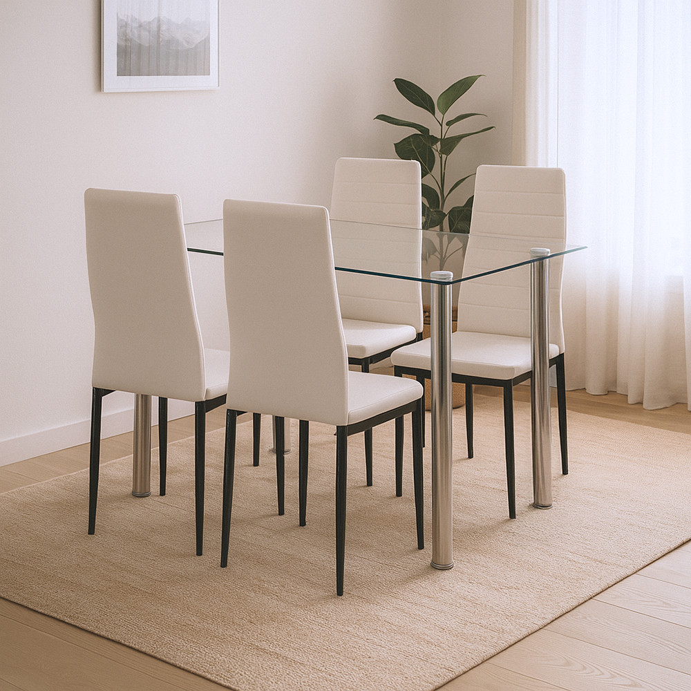 A Mateo étkezőgarnitúra központi eleme a Leziter Berna 120 cm-es üveg étkezőasztal, amely a modern enteriőrök egyik legnépszerűbb darabja. A 8 mm vastag, hőkezelt edzett üveglap nemcsak elegáns megjelenést biztosít, hanem rendkívül ellenálló a karcolásokkal és ütődésekkel szemben. Az üvegfelület könnyen tisztítható, így a mindennapi használat során is megőrzi fényes, letisztult külsejét.