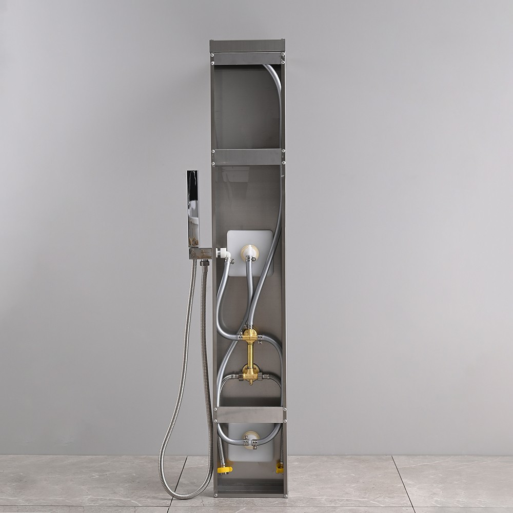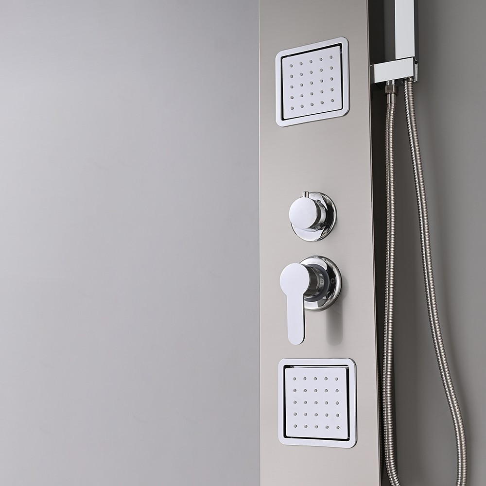 A zuhanypanel további funkciói közé tartozik egy vízesés, amely egy másik különleges élményt nyújt. A vízesésnek köszönhetően a víz folyik lefelé az ember hátára, kellemes masszázsszerű hatást nyújtva, és feloldva az izmok feszültségét. A vízesés funkcióval kombinálva hátsó fúvókák találhatók a zuhanypanelen, amelyek különösen jótékony hatással vannak a hátmasszázsra. A zuhanypanel további kényelmi funkcióval rendelkezik egy kézi zuhannyal is, amely lehetővé teszi a célzottabb vízirányítást és a zuhanyozás személyre szabását. A kézi zuhany praktikus, ha nem szeretnénk beállni az esőztető vagy a vízesés alá, vagy ha csak a hajmosáshoz vagy a test adott részének tisztításához van szükségünk a zuhanyozás közben.