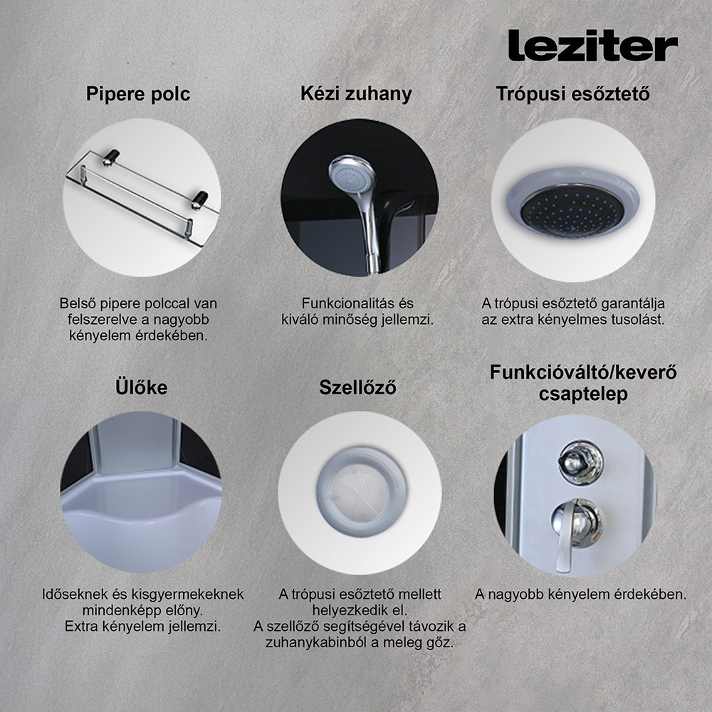 A Mila hidromasszázs zuhanykabin beépített ülőkével rendelkezik, amely különösen hasznos idősebbeknek, mozgásukban korlátozottaknak vagy azoknak, akik szeretik a nyugodt, ülve történő zuhanyzást. A belső piperepolc segít rendben tartani a tusfürdőt, sampont és egyéb kiegészítőket. A kabin tetejében elhelyezett szellőzők biztosítják a meleg gőz távozását, ezzel csökkentve a párásodást.