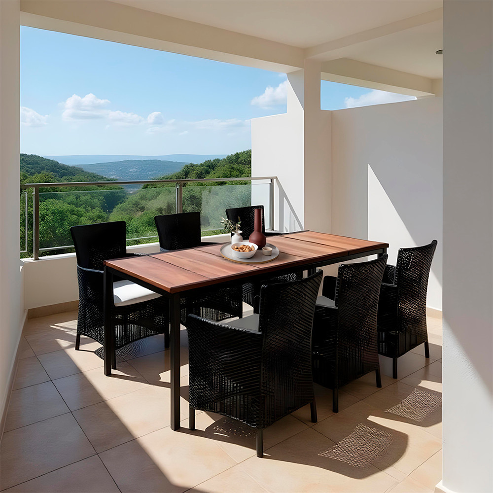 - Összeállítás: 6 db Iowa Rattan Style karfás fotel + 1 db Porto 200 étkezőasztal