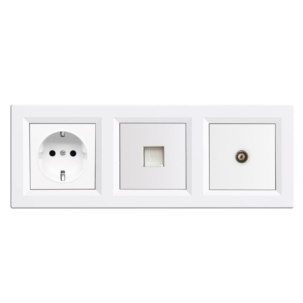Ez a Nova szerelvényszett ideális megoldás azoknak, akiknek fontos a funkcionalitás, az esztétikum és az egységes megjelenés. A hármas kialakítás egy földelt 230 V-os csatlakozóaljzatot, egy RJ-45-ös UTP aljzatot és egy koaxiális TV csatlakozót foglal magába – mindezt egyetlen, letisztult fehér keretbe rendezve. A vízszintes modulelrendezés praktikus és jól átlátható.