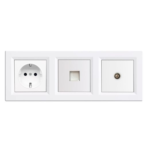 Nova hármas csatlakozóaljzat szett – földelt dugalj, UTP és TV aljzat egyben, letisztult fehér kerettel