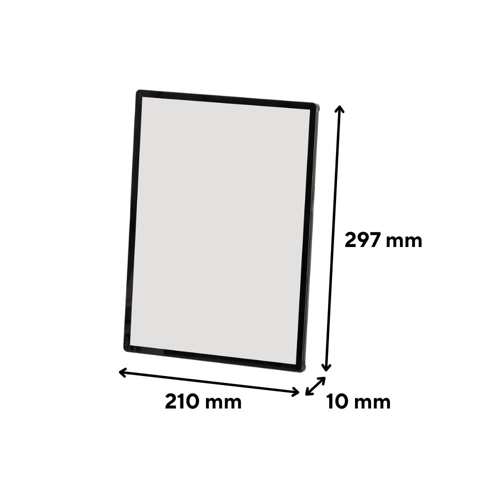 A belső méret pontosan illeszkedik az A4-es szabványhoz, míg a külső méret minimálisan nagyobb, így helytakarékos és jól elfér falon, ajtón, információs táblán vagy pult mögött. Ideális választás akkor is, ha egyszerűen szeretnél kiemelni egy fontos tartalmat – legyen az információ, kép vagy irat.