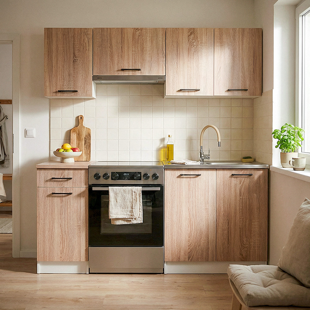 A bútor 16 mm vastag laminált bútorlapból készül, amely strapabíró, könnyen tisztítható, és a mindennapi konyhai használat során is megőrzi esztétikus megjelenését. A külön megvásárolható 28 mm-es munkalap színazonos dekor élzárással extra stabilitást és hosszú élettartamot biztosít, miközben könnyen tisztán tartható, így a konyha mindig higiénikus és rendezett maradhat. A korpusz elemek színazonos ABS élzárással készülnek, ami tovább növeli a tartósságot.