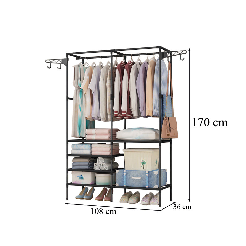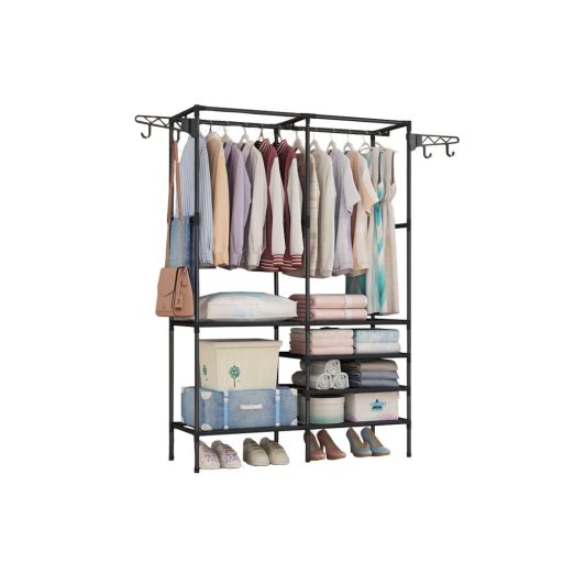 • Multifunkcionális kialakítás: Az állvány több polccal és egy akasztórúddal rendelkezik, amelyek lehetővé teszik különböző típusú ruhák, cipők és egyéb kiegészítők tárolását.