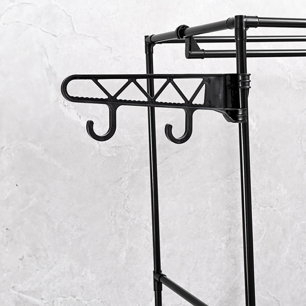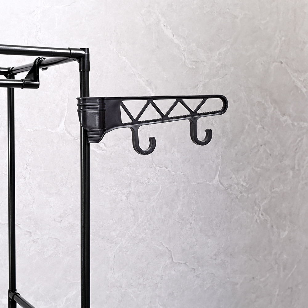 • Megnövelt funkcionalitás: A dupla akasztók mellett az állvány további polcokkal és fogantyúkkal rendelkezik, amelyek tovább növelik a funkcionalitást és lehetővé teszik a különböző tárgyak rendszerezését.