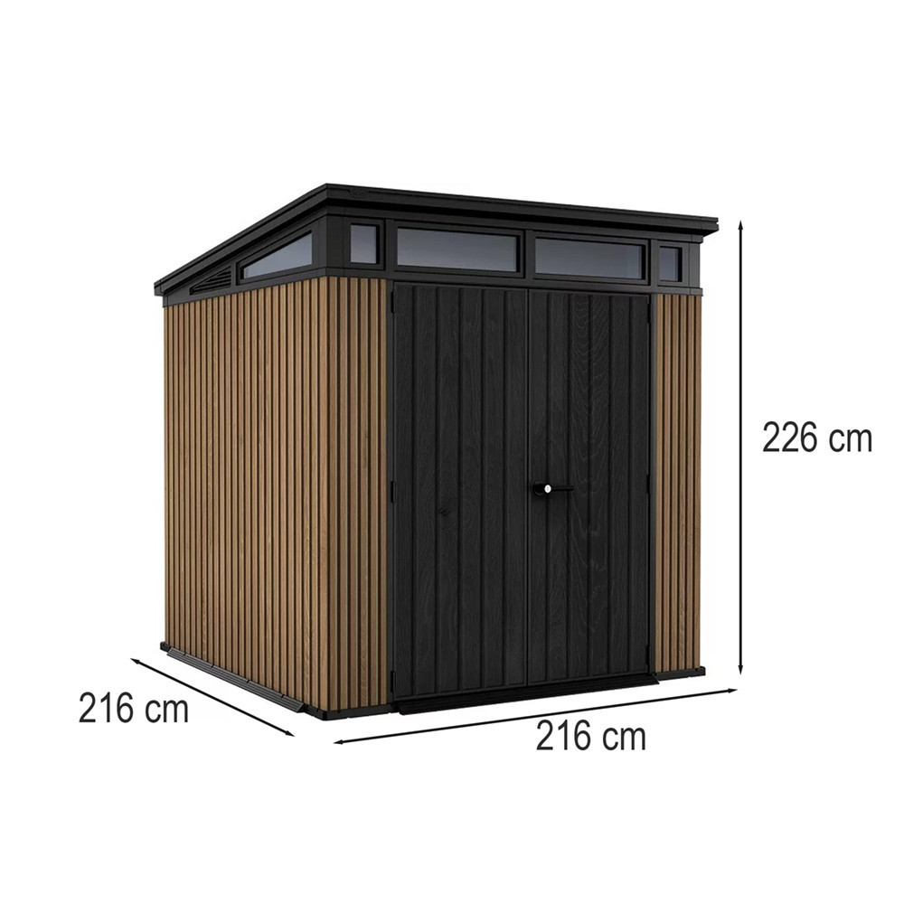 A Decocoat technológiával készült műanyag panelek természetes fa hatást keltenek, miközben teljesen gondozásmentesek. A megerősített acélszerkezet stabilitást biztosít, a lakattal zárható ajtó pedig extra védelmet nyújt. Méretei: 216x218x226 cm
