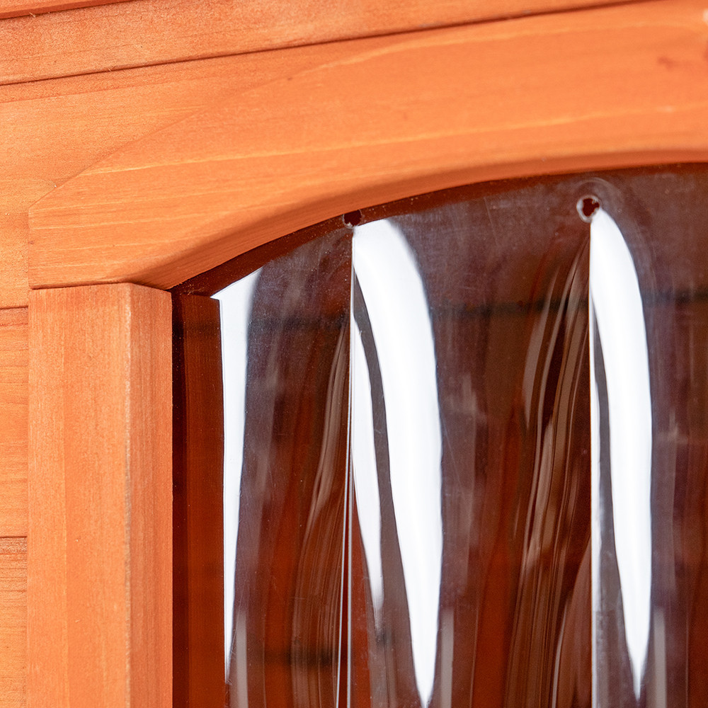 A lapostetős kivitel különösen előnyös szűkebb helyeken, ahol fontos a helytakarékos elhelyezés. A tetőt homokszórt bitumenes kátránypapír borítja, amely megbízható védelmet nyújt eső és nedvesség ellen. A lamellás műanyag ajtó csökkenti a huzatot, távol tartja a szelet és a csapadékot, miközben könnyű ki- és bejutást biztosít a kutyának.