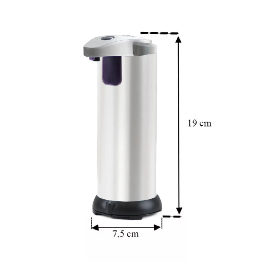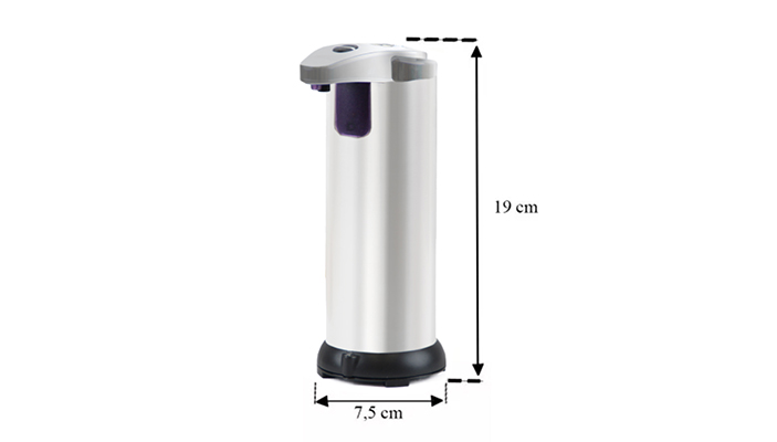 Az adagoló rozsdamentes acélból és műanyagból készült, króm színű. A mérete 7,5 x 12,5 x 19 cm (Szé x Mé x Ma), és egy adagoló kapacitása 220 ml. Az adagoló szabadon álló kialakítása lehetővé teszi a könnyű elhelyezést bármelyik helyiségben. A szappanadagolók használatához 2 db AAA elemre van szükség (nem tartozék).