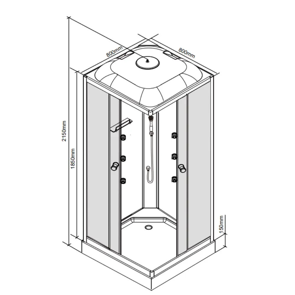 • Magasság: 185 cm (kabin), 215 cm zuhanytálcával együtt
