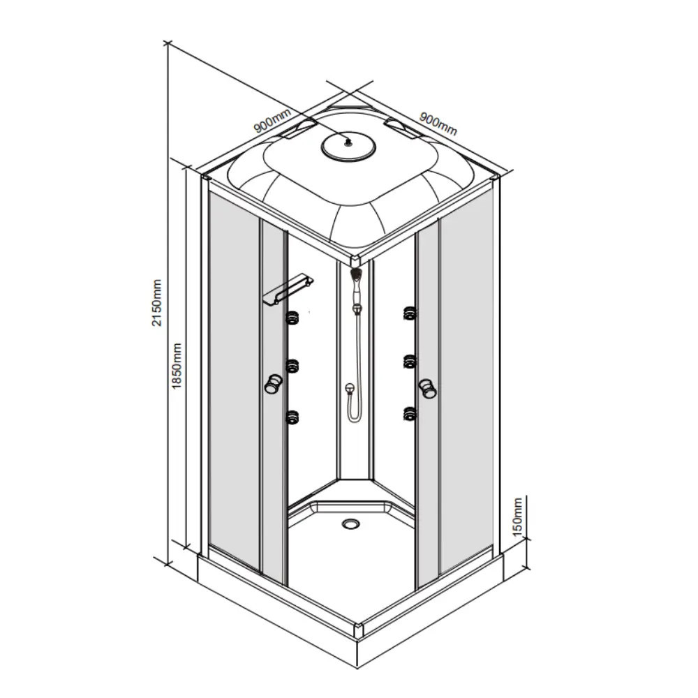 - Magasság: 185 cm (kabin), 215 cm zuhanytálcával együtt
