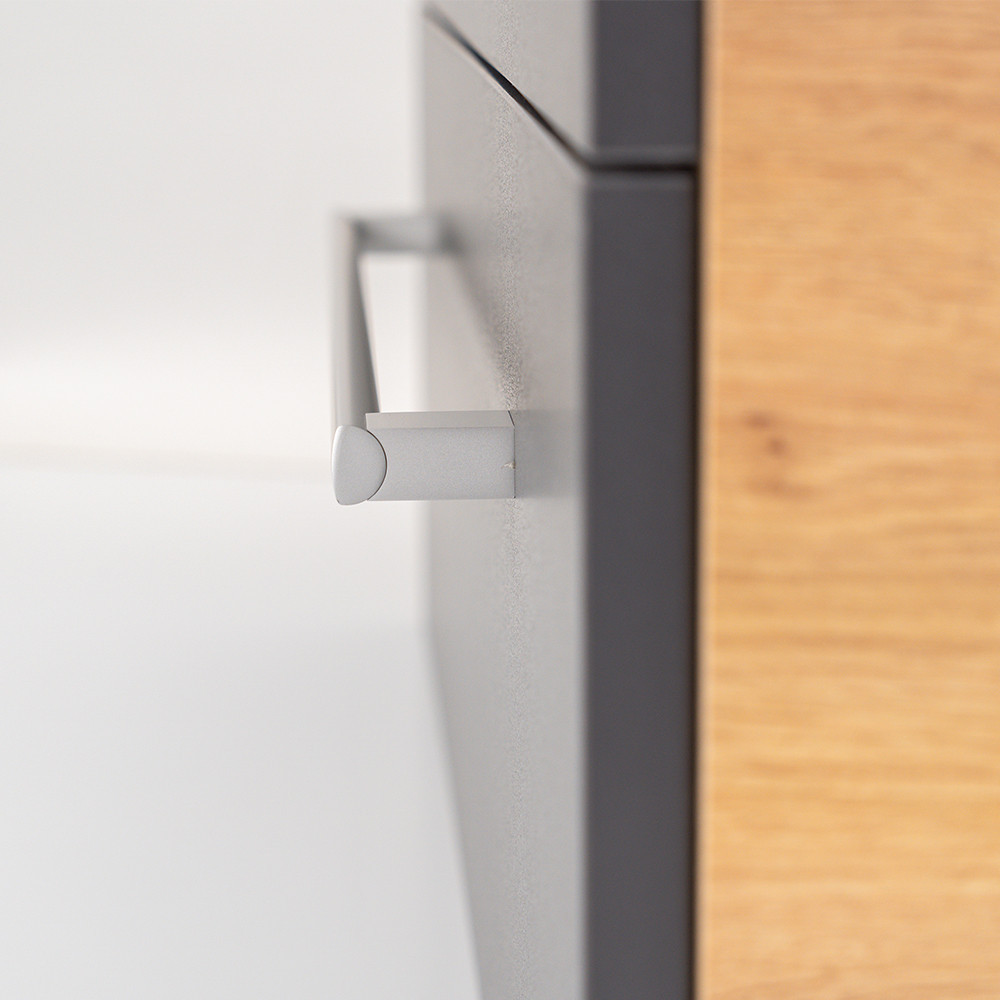 Az tölgy korpusz és a antracit front kombinációja elegáns és időtálló megjelenést kölcsönöz a bútornak.